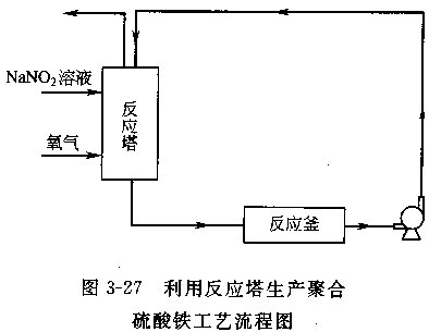 圖3—27是以亞硝酸鈉為 合成時(shí)首先將硫酸亞鐵和硫酸混合液加入溶液貯罐中,反應(yīng)過(guò)程中通過(guò)循環(huán)泵的作用保持液體在反應(yīng)器和貯罐之間不斷循環(huán),以達(dá)到氧化硫酸亞鐵的目的。催化劑以溶液的形式在反應(yīng)塔上部加入,氧氣在反應(yīng)底部引入。通過(guò)液體流經(jīng)填料表面時(shí)的混合作用加強(qiáng)氣液接觸,提高反應(yīng)速度。利用反應(yīng)塔法生產(chǎn)可以達(dá)到平均每小時(shí)生產(chǎn)1t的速度。利用反應(yīng)釜也可以達(dá)到非??斓姆磻?yīng)速度,平均30~40min可以生產(chǎn)1t產(chǎn)品,且隨著操作熟練程度的提高,