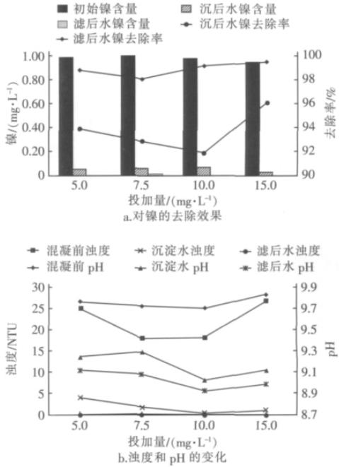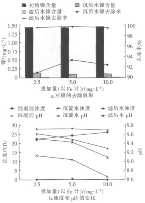 圖1聚合硫酸鐵投加量對鎳及濁度去除效果的影響