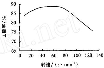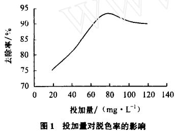 由圖3可看出,在60 - 80 r/min時(shí)攪拌速度對(duì)絮凝結(jié)果影響不大,小于這個(gè)范圍則由于水樣和絮凝劑混和不夠充分,反應(yīng)不完全;大于這個(gè)范圍,尤其是超過100 r/min之后,脫色率急劇下降,這是由于攪拌速度過快,使形成的絮團(tuán)又被打碎,因而絮團(tuán)非常小,沉降效果很差,絮凝后幾乎不分層,且沉淀時(shí)間很長(zhǎng),都會(huì)使得絮凝結(jié)果不理想。