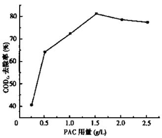 絮凝劑PAC的用量是否合理關(guān)系到沉淀是否徹底、處理是否更有效及生產(chǎn)成本是否更低,因此需要對此進(jìn)行實驗以準(zhǔn)確確定其用量。實驗所用廢水的CODcr為4480mg/L,根據(jù)實驗方法,在實驗過程中固定PAM的加入量為10mg/L,pH值為7.0,僅改變絮凝劑PAC的用量??疾煨跄齽㏄AC用量對CODcr去除率的影響,實驗結(jié)果見圖1。