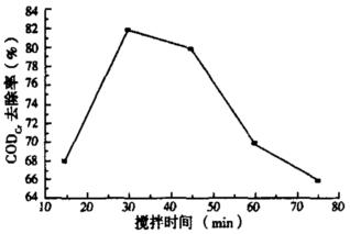 華泉總廠技術(shù)人員選用某洗滌劑生產(chǎn)廢水作為處理水質(zhì),通過實驗,取的了最佳的實驗條件,即絮凝劑聚合氯化鋁加入量為1.5g/L,助凝劑聚丙烯酰胺的加入量為10mg/L,pH值固定為7.0,攪拌速度為60r/min,僅改變絮凝反應(yīng)的攪拌時間,觀察攪拌時間對CODcr去除率的影響,實驗結(jié)果見下圖。